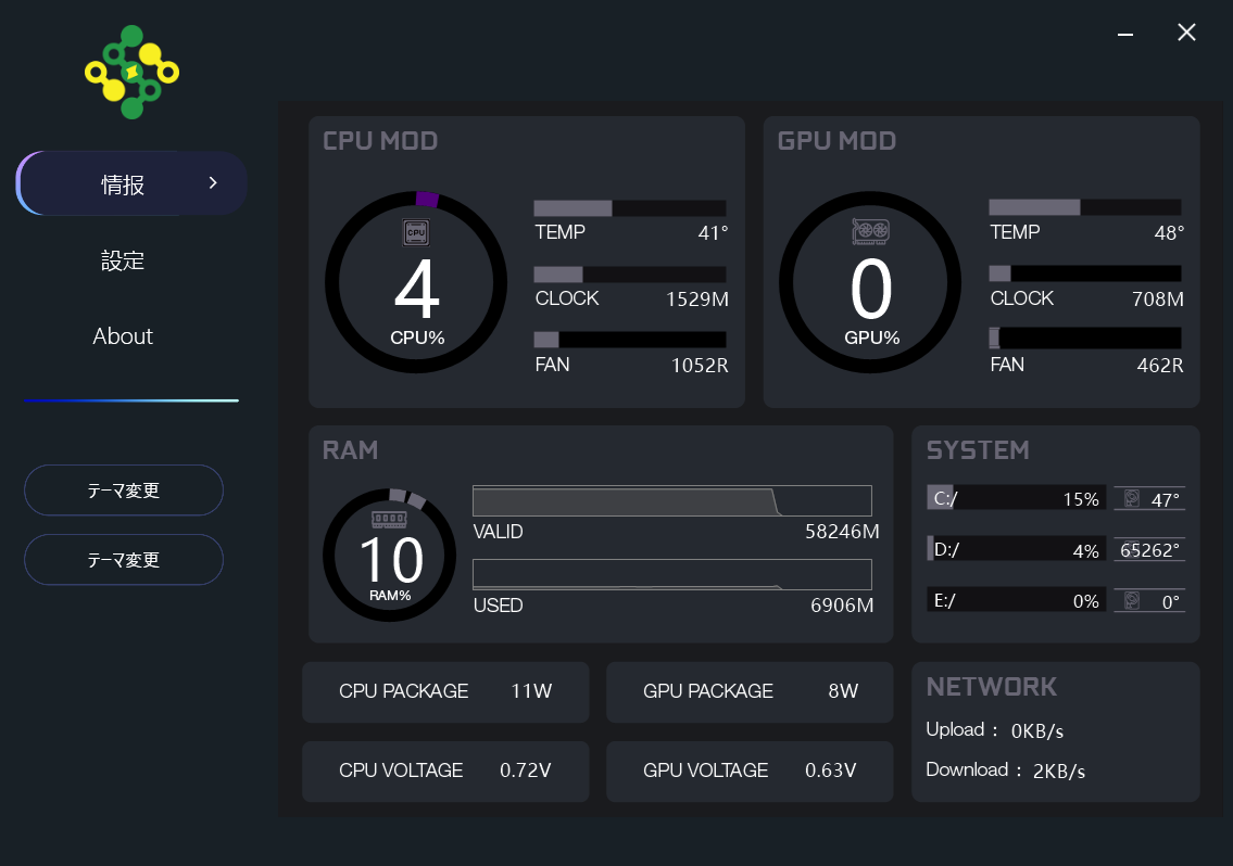 ②起動すると、CPUやGPUの温度を表示する画面が表示されます。