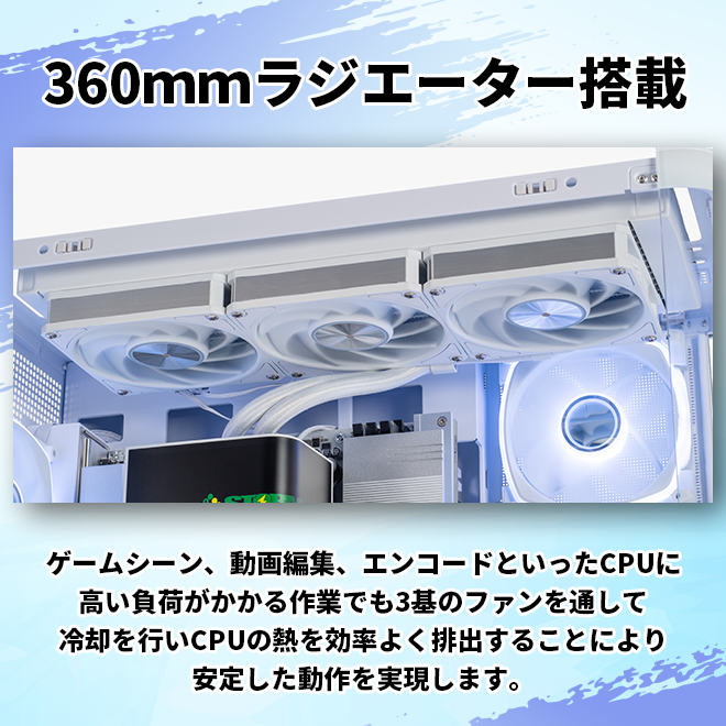 ゲームシーン、動画編集、エンコードといったCPUに高い負荷がかかる作業でも3基のファンを通して冷却を行い、CPUの熱を効率よく排出することにより安定した動作を実現します。
