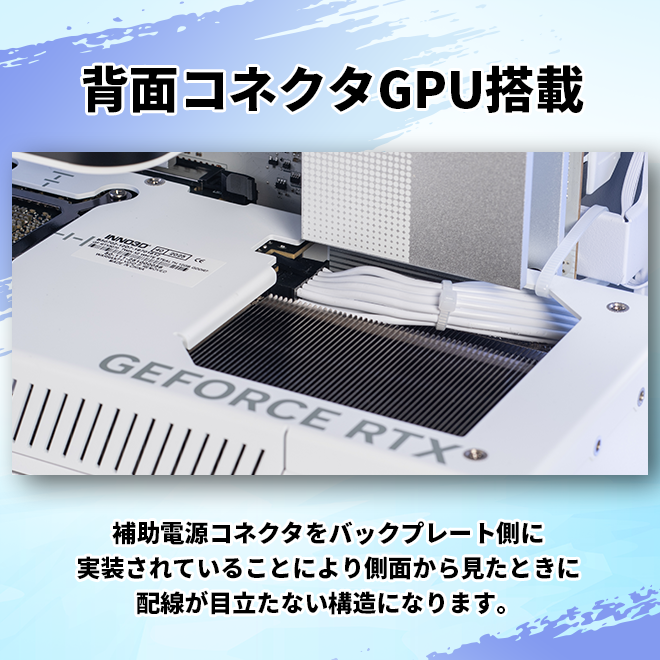 背面コネクタマザーボード、グラフィックボード採用 背面にコネクタが実装されたマザーボードとバックプレート側に補助電源が実装されたグラフィックボードを搭載により表から配線が見えにくく、美しい配線管理が可能になりました。