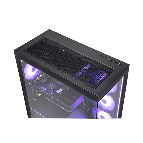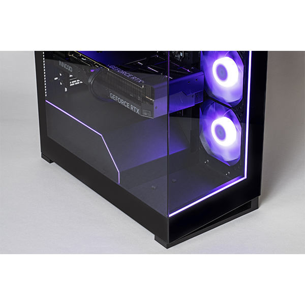 - フロントとサイドにRGB対応のLEDラインを搭載、4基のファンと連動することによって内部パーツを彩り洗練された見た目と高級感を演出。